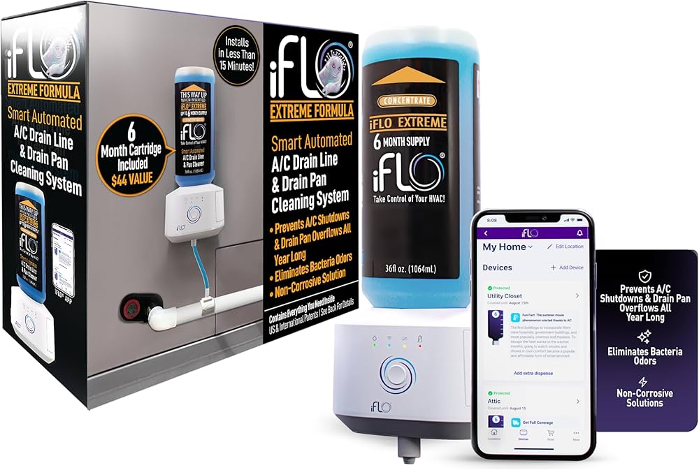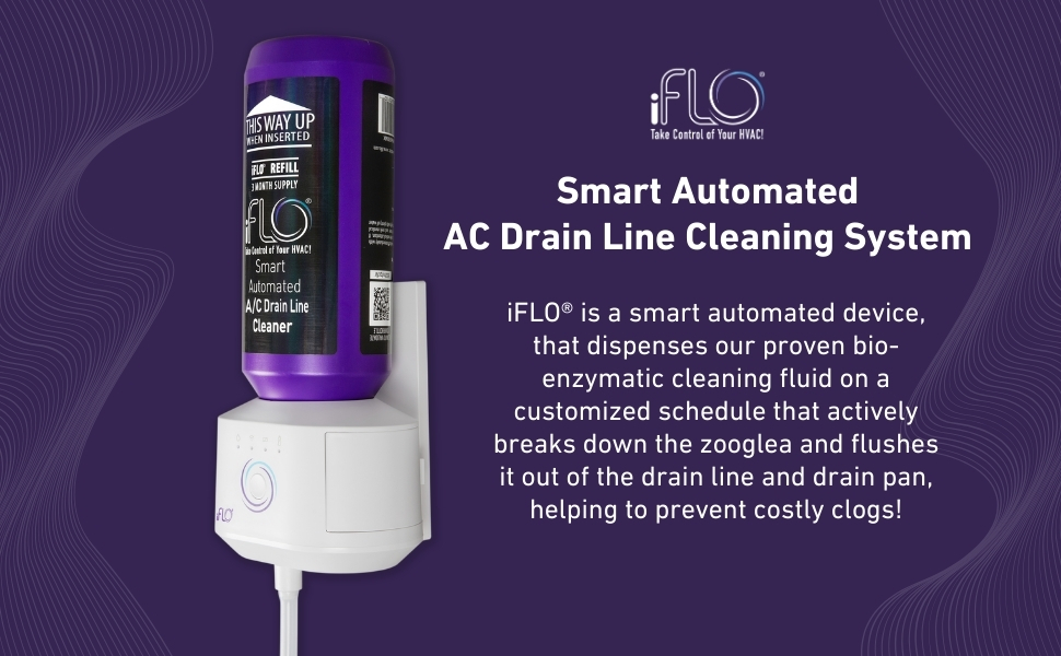 The iFlo Smart Automated A/C Drain Line Cleaning System is an innovative device designed to automatically clean and protect your AC drain line. It helps prevent clogs, overflows, and water damage by regularly flushing the condensate line.